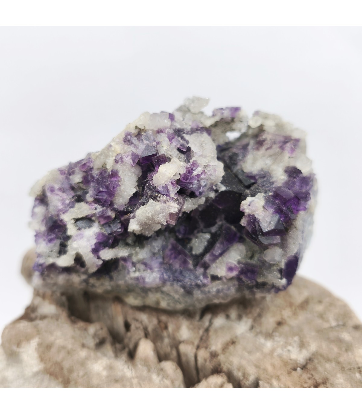 Pièce atypique pour cette pièce de la mine du Burc. La gangue est de la fluorite bleue massive ce qui ne laisse aucun doute quant à la provenance ; Les cristaux violet de 5mm sont imbriqués dans des lamelles de quartz; les plus gros cristaux dans une partie géodique atteignent le cm. pas courant...mais intéressant pour la systématique.