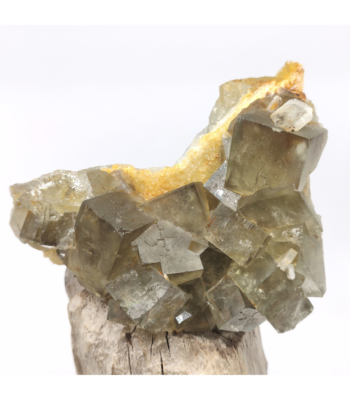 Pièce de fluorite et Barite de la mine de L'Avellan issue de la trouvaille de 1982. Les cubes de fluorite verte sont brillants, mesurent jusqu'à 3 cm et sont implantés sur quartz. Les cristaux sont limpides, extrémements brillants sur 3 faces; on voit un beau zonage violet/vert foncé en périphérie. quelques cristaux de baryte blanche translucide en leur coeur donnent du contraste à la pièce. Malgré quelques imperfections sur les angles, cela reste un classique de la minéralogie française.