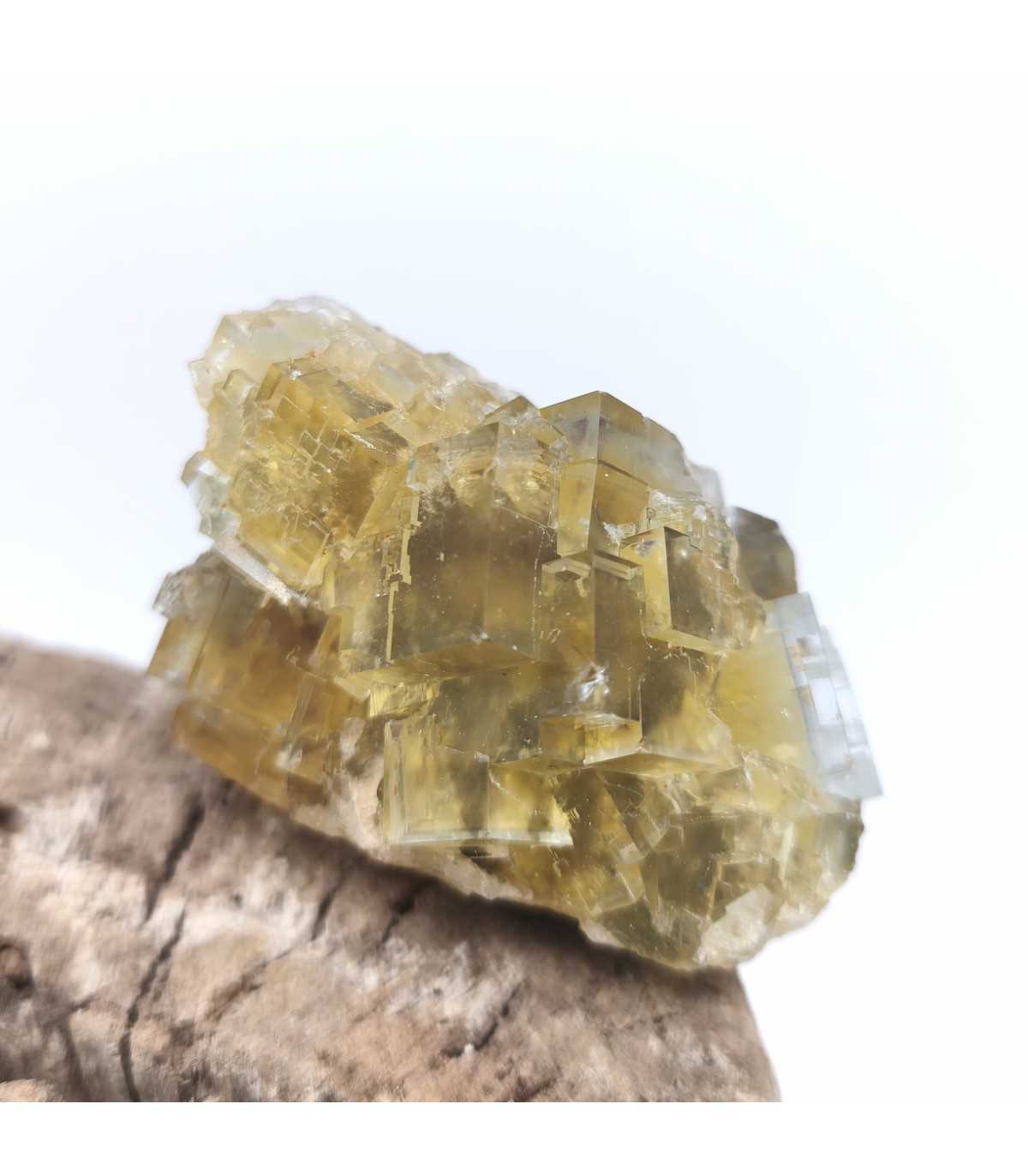 fluorite de la mine de la Barre composée de cubes jaunes à liserés bleutés. la pièce a un bon volume; les cubes sont brillants et en bon état. Le cube principal polysynthetique de 2cm devoile, de beaux zonages . les cubes se sont développés sur un morceau de gangue de fluorite verte. on note quelques contacts à l'arrière de la pièce.