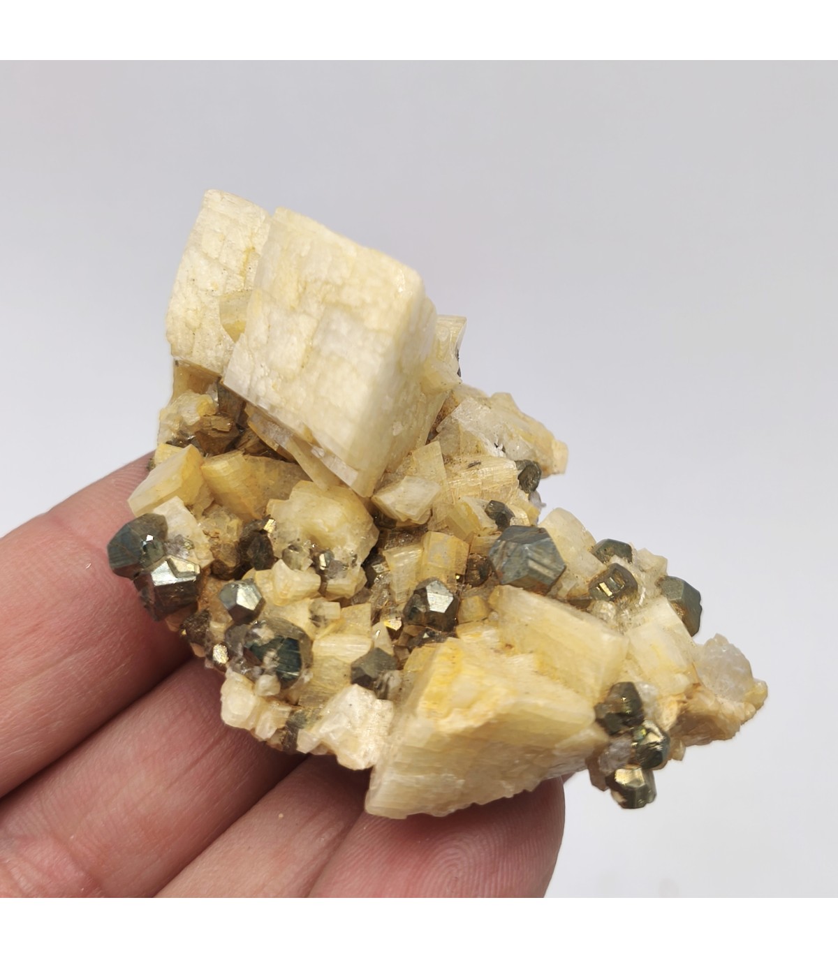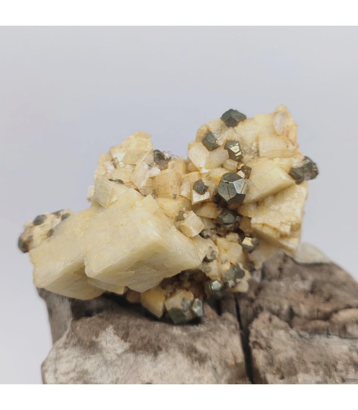 Pièce de pyrite sur dolomite de saint Pierre de Mésage. Le cristal principal de dolomite mesure 3cm. les cristaux de pyrite jusqu'à 6mm sont disséminés sur les dolomites ce qui donne un bon contraste. La pièce a une bonne esthétique. ex collection Boël D.