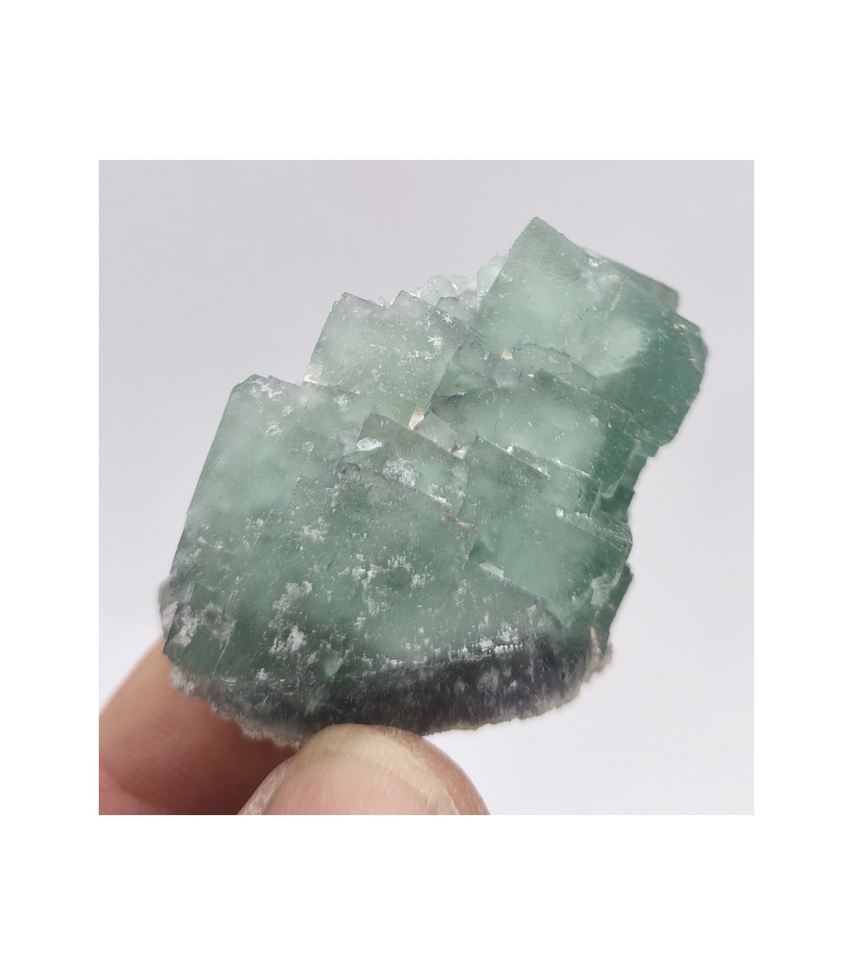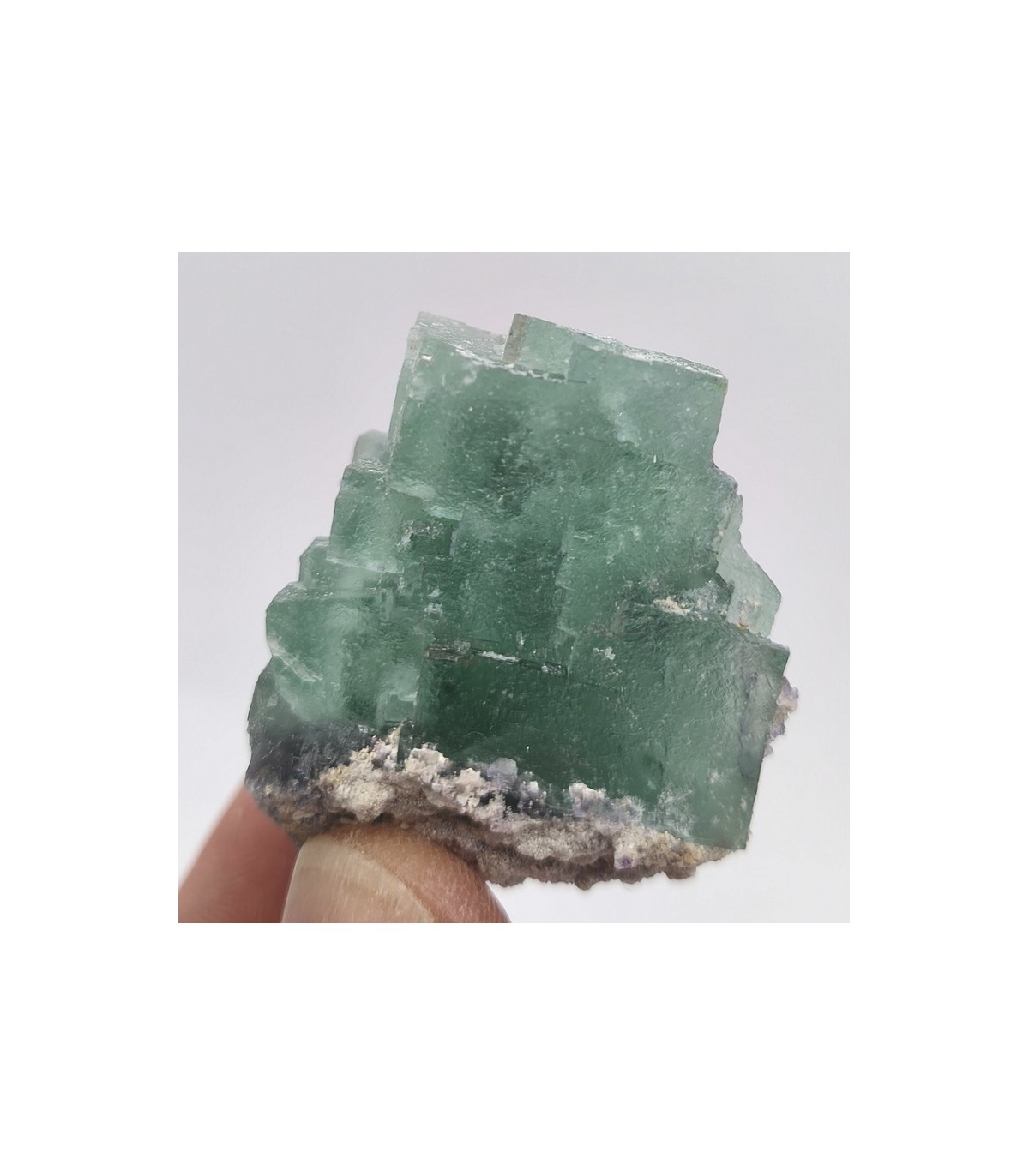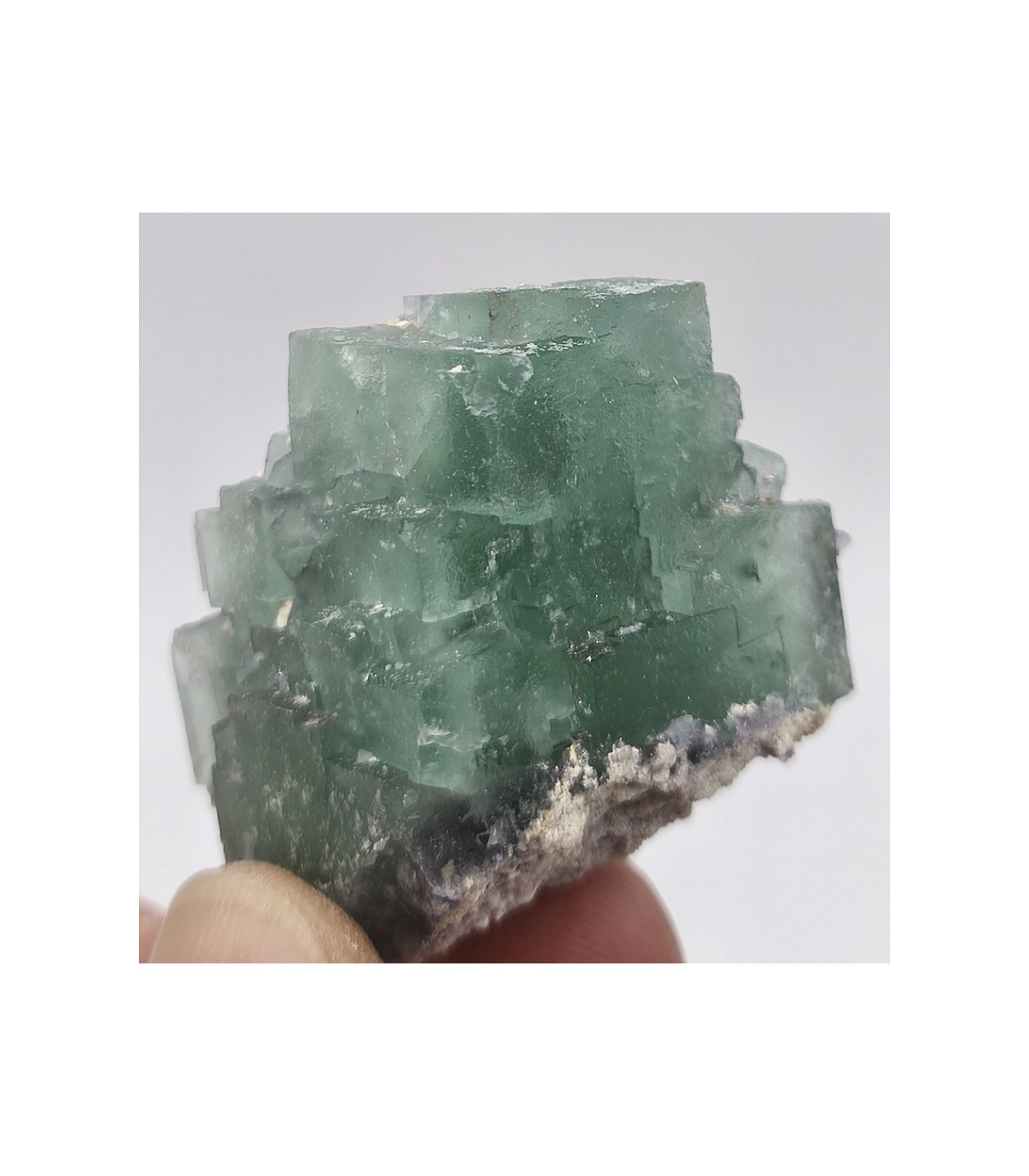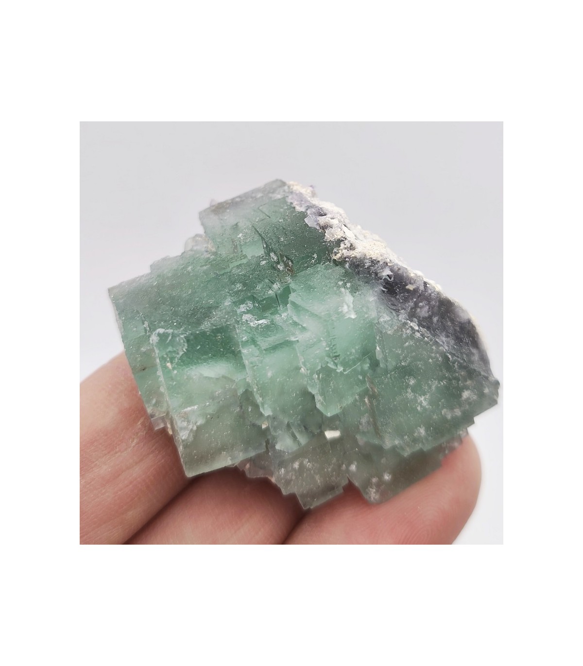 Fluorite vert Menthe de la mine de Pratclaux. Une belle structure en escalier, un coeur violet et un éclat soyeux... La présence d'argile blanche intersticielle donne un côté vert pâle à ce cristal. Toutes les pièces proviennent d'une zone proche de celle ayant donné des octaèdres recouvert de quartz avec 2eme génération.
