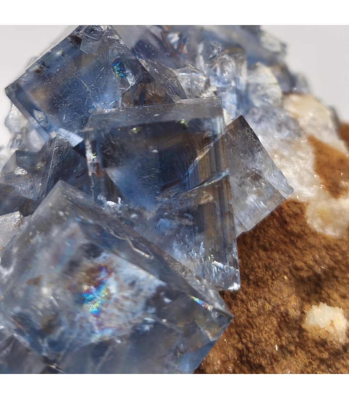 jolie pièce de fluorite de la mine de la Barre issue des années 80. Les cubes jusqu'à 1.7cm ont une bonne couleur intense due à de multiples fantômes ; ils sont implantés sur une gangue de calcédoine oxydée caractéristique..Les cubes sont en bon état avec un bon contraste de couleur qui agrémente le tout.