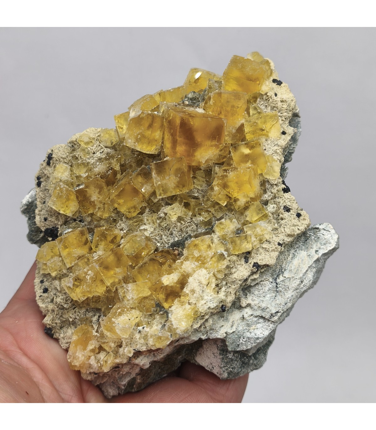 Pièce de fluorite composée de cubes jaunes vifs jusqu'à 1.5cm sur sidérite et sphalérite. Les cubes sont bien répartis et en bon état.