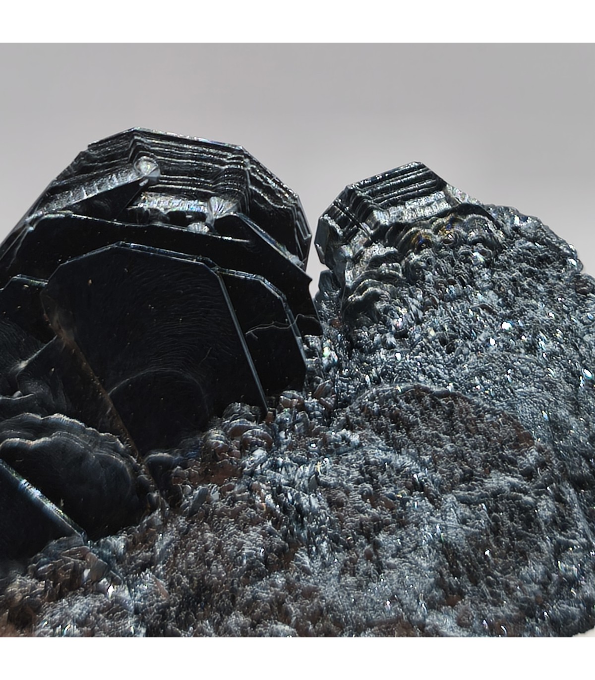 Lame d'hématite fumerollienne d'une bonne dimension pour la chaine des Puys. La lame est épaisse; on voit de figures de croissance et de belles terminaisons. La brillance est extrême pour cette lame qui montre des figures réticulées intéressantes.
